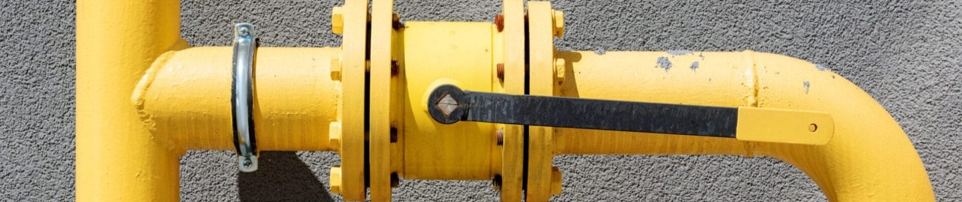 Close-up of a yellow industrial pipe with a black metal lever handle against a textured gray wall, certified by RPZ Valve Testers.